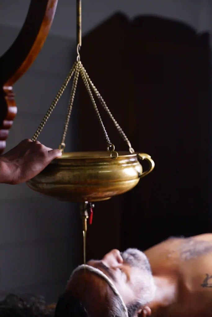 A relaxing technique in which heated medicinal oil is poured over the forehead to reduce tension, improve sleep, and regulate the body’s hormonal system.